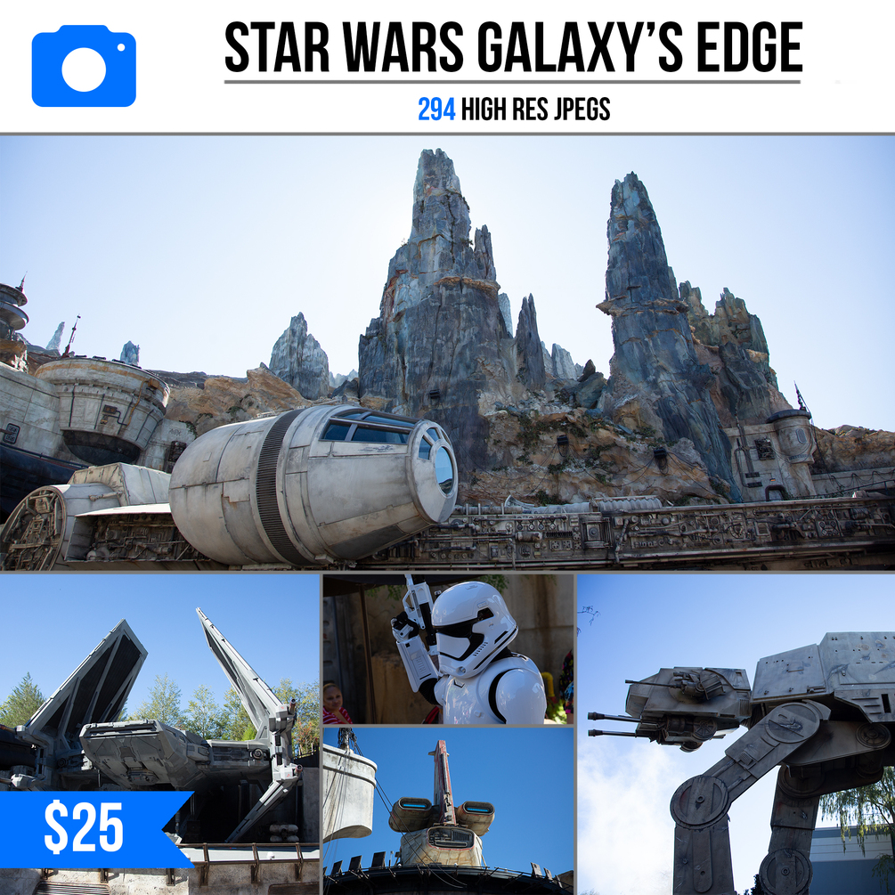 This stock image package was created for digital artists who need stock images mainly for the compositing process in Photoshop. There are 294 jpgs shot between a Canon 5D Mark III & Sony Alpha 7R II. Canon images are 5760 x 3840 pixels, Sony images are 7952 x 5304 pixels. You will see everything from the beautiful mountainscape of Galaxy's Edge, rustic & rocky textures, spaceships like the Millennium Falcon, Tie Fighters, X-Wings, futuristic designs in architecture, buildings, doors, droids, buttons, panels, Stormtroopers, speeders, giant AT-ATs, & much more!